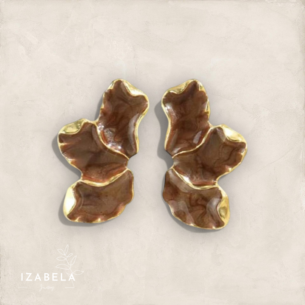 Gold leaf-shaped earring worn by a person with 'IZABELLA' branding.